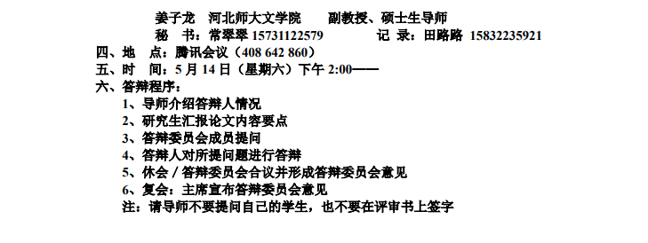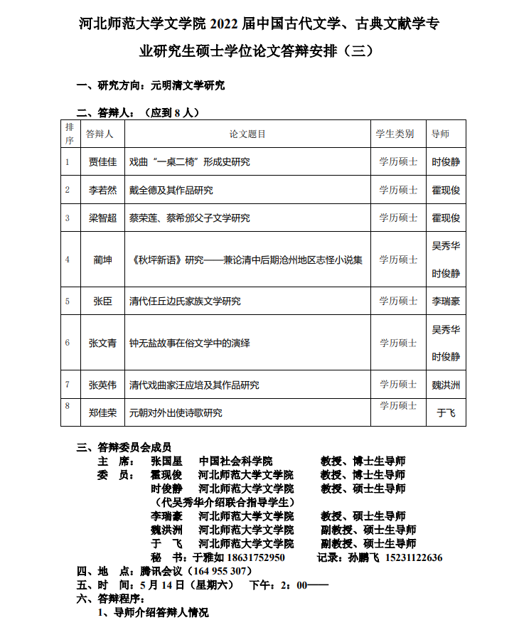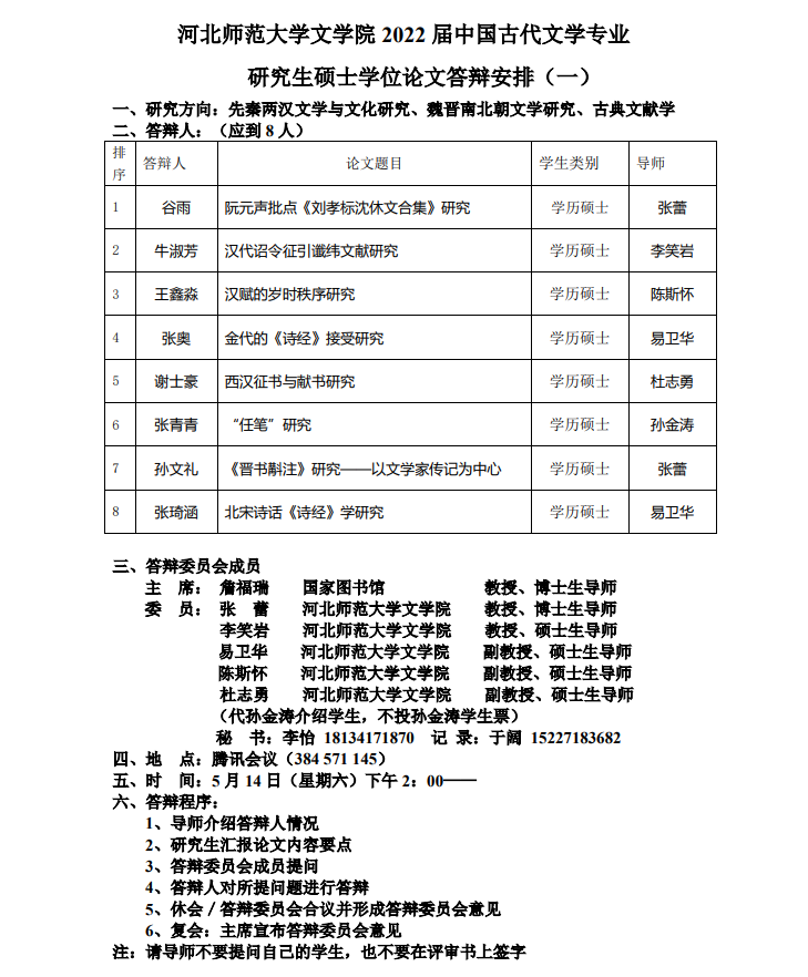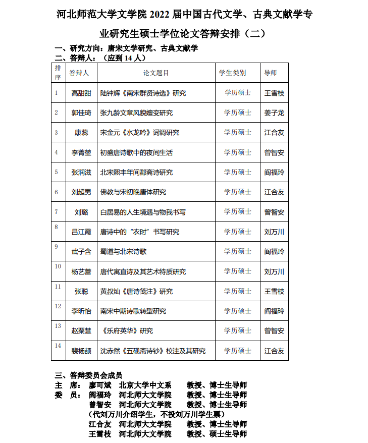 2022届古代文学、古典文献学硕士研究生学位论文答辩安排(14日答辩)