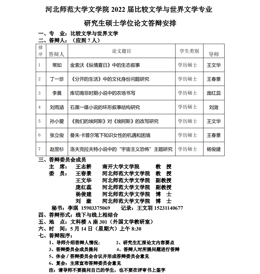 2022届比较文学与世界文学硕士研究生学位学位论文答辩安排(14日答辩)
